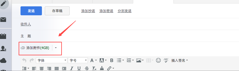 普通附件:编辑邮件界面直接单击 添加附件 按钮,即可上传,见下图所示。